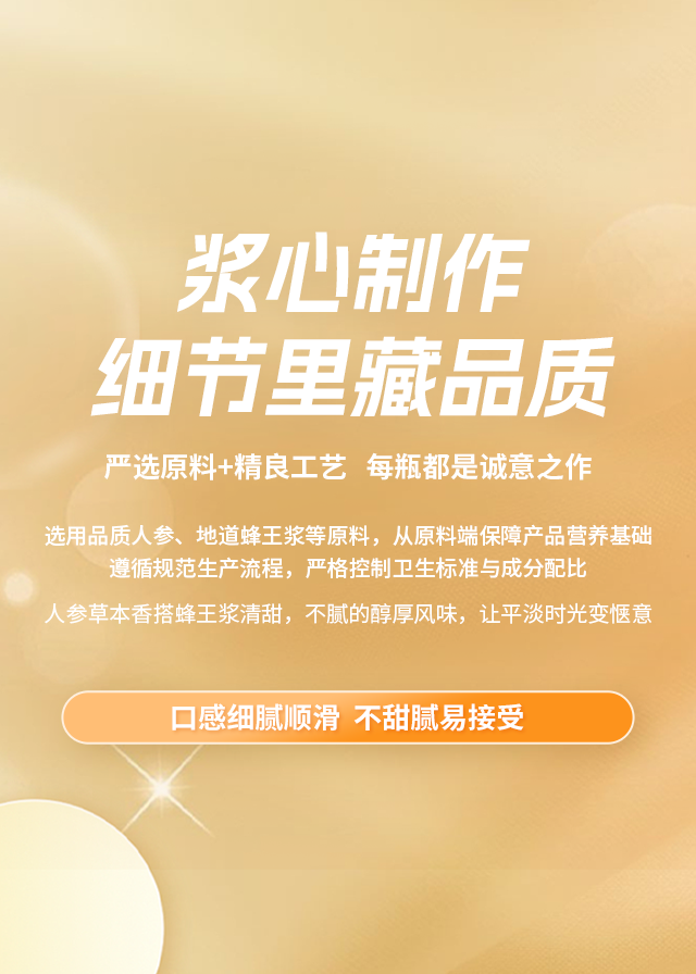 入口兼具蜂王浆的清甜与人参的醇厚,口感细腻顺滑,不甜腻、易接受。与众不同的风味搭配,既保留了原料的自然香气,又经过精心调配,满足不同人群的口感偏好,让饮用成为一种愉悦的味觉享受。